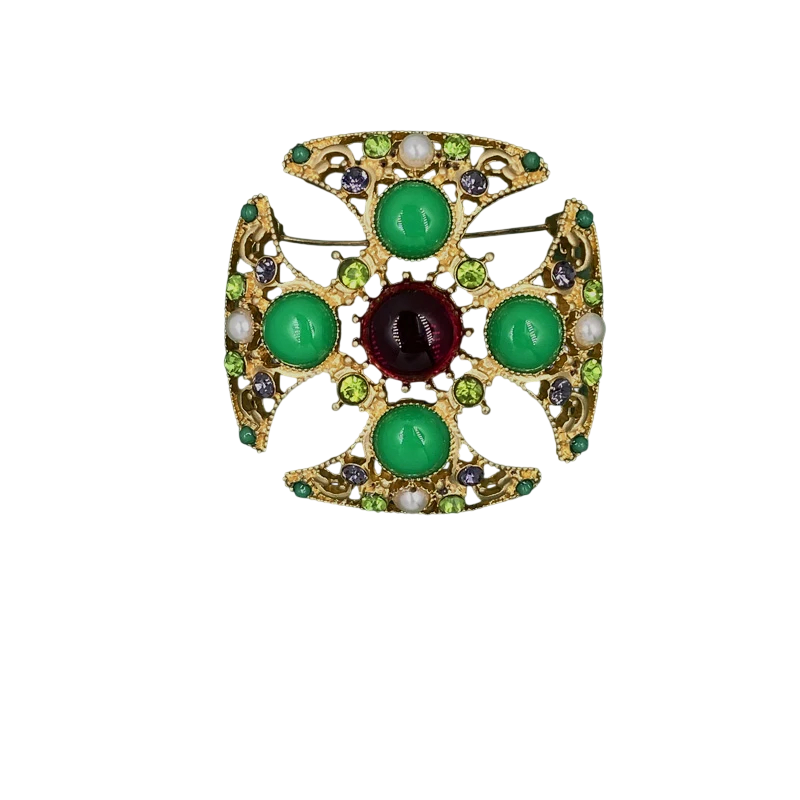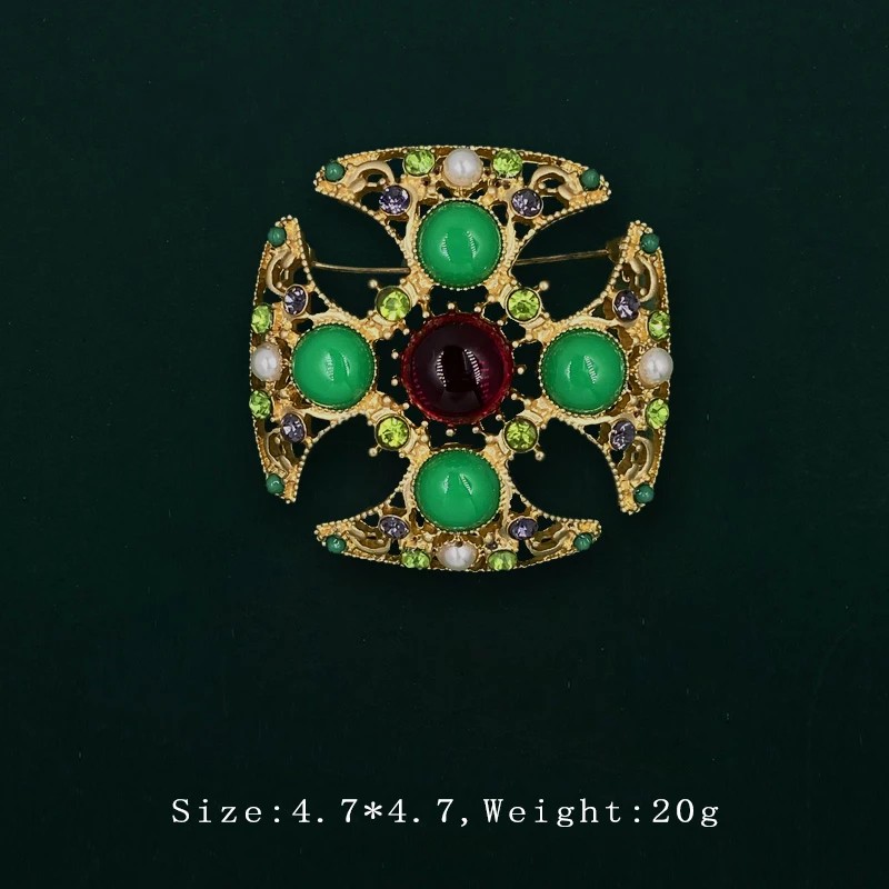 Brochen er designet med fokus på detalje og æstetisk balance, hvilket gør, at den fremstår luksuriøs, men ikke overdrevent prangende. Den grønne barok design bringer et originalt farveaccent, der nemt kan kombineres med neutrale og mere markante outfits. Perlestenene tilføjer smykket en delikathed og understreger dets elegante karakter. Den anvendte zinklegering sikrer styrke og stabil form ved almindelig brug. Takket være sine mål 4,7 x 4,7 cm / 4,7 x 4,3 cm er brochen tilstrækkeligt markant uden at virke forstyrrende.