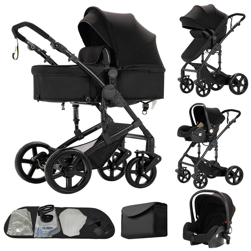 Multifunktionel børnevogn 3i1 med autostol og vugge, affjedret ramme, bomuld, kombineret system til daglig brug
