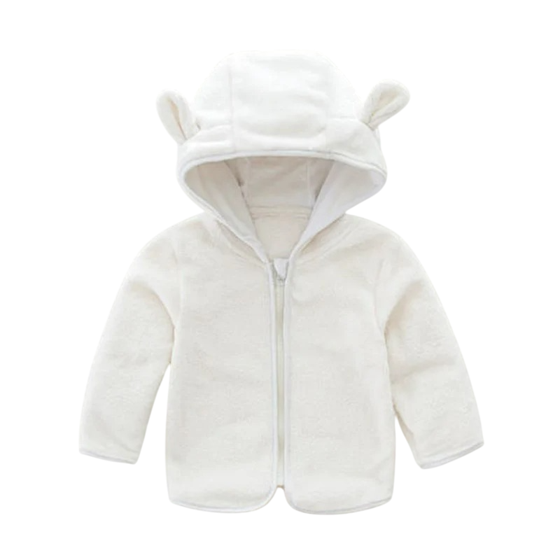 Sød pige vinterjakke i plysstof med hætte med ører og lynlås. Varmt bomulds-polyester design ideelt til vinterdage. Fuld beskrivelse