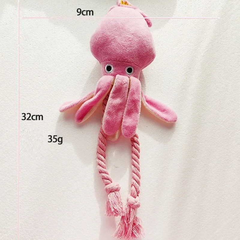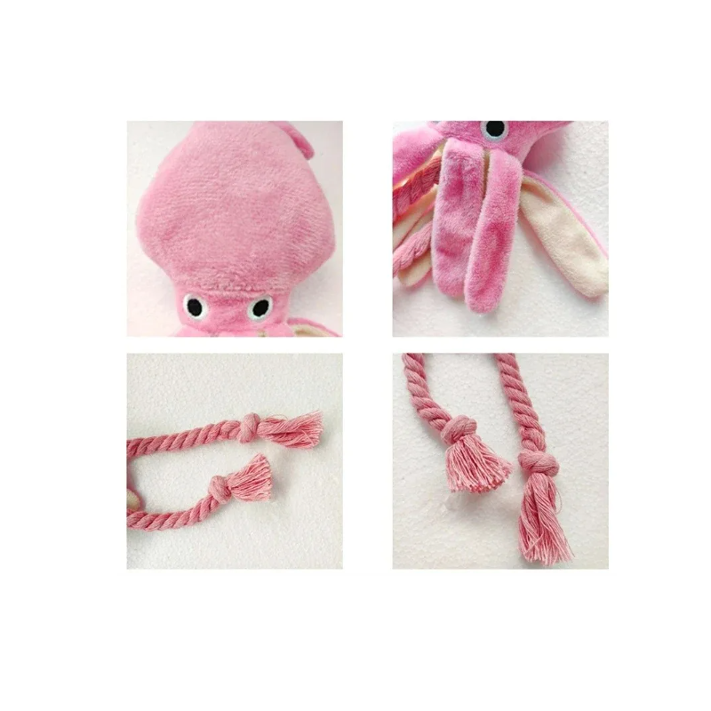 Dette plysdyr blæksprutte er den ideelle legetøj til hunde, der elsker interaktiv leg. Den kombinerer et blødt plyskrop med holdbare rebkløer, hvilket tilbyder forskellige måder at have det sjovt på – fra at tygge til at trække. Takket være det attraktive udseende og sikre design er den velegnet til hunde i alle størrelser. Den hjælper med at rense tænderne og fremmer sundheden i tandkødet.