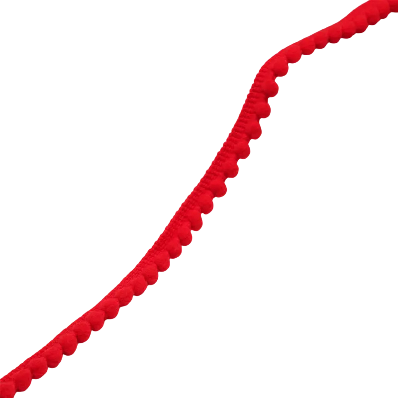 Strimlen er lavet af en kombination af polyester og bomuld, hvilket sikrer god holdbarhed og en behagelig struktur af materialet. Dette gør den nem at arbejde med ved syning, limning eller anden fastgørelse på forskellige overflader. Plys pomponerne skaber en dekorativ kant, der er populær f.eks. ved udsmykning af puder, gardiner, børnetøj eller forskellige kreative produkter.