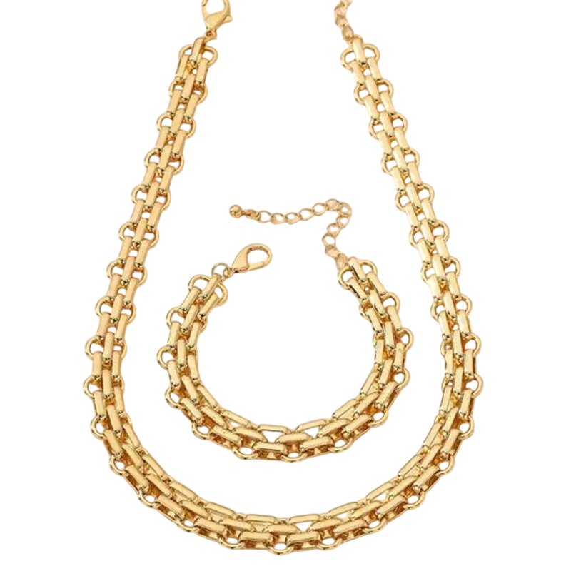 Dette fest sæt af smykker er perfekt til kvinder, der ønsker at fremhæve deres personlighed uden unødvendige dekorative elementer. Punk stort led stil tiltrækker opmærksomhed og forbliver samtidig tidløst. Takket være den praktiske lukning er det behageligt og fleksibelt at bære. Hvis du leder efter markant led halskæde og armbånd, som bliver det dominerende element i outfittet, er dette sæt den ideelle valgmulighed for moderne og selvsikre kvinder.