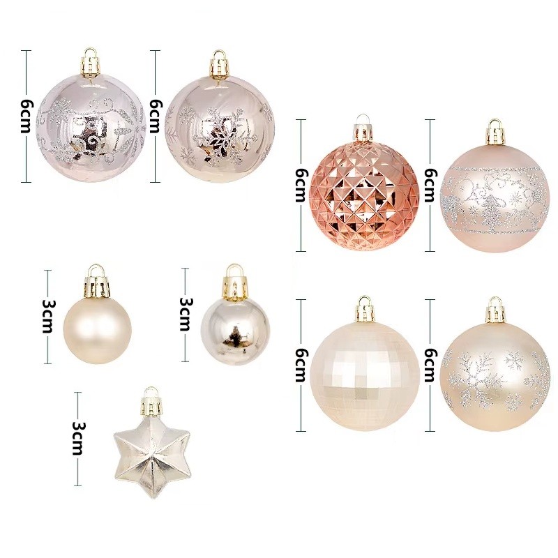 De enkelte pynt har en diameter på 3 - 6 cm, hvilket er den ideelle størrelse til jævnt at fordele dem over hele juletræet. I sættet er der repræsenteret former af kugler og stjerner, som er blandt de traditionelle julemotiver. Rosa gyldne farveudførelse virker delikat og elegant. Forskellige størrelser af pynt skaber en rumlig effekt. Julepynten er velegnet ikke kun til at dekorere træet, men også til dekoration af kranse, festlige borde, hylder, vinduer eller festlige arrangementer i indretningen. Takket være den lette udførelse er de nemme at hænge op og er velegnede til årlig brug.