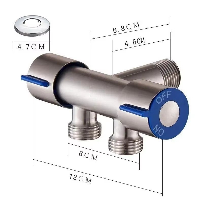 Forside Forside Hjem og husholdning Til badeværelset Badeværelsestilbehør Rustfrit stål dobbeltarmet vandhane 12 x 6,8 cm Enkel vandhane til koldt vand med 1 indgang og 2 udgange Ventil til badeværelse og toilet Holdbar stålvandhane