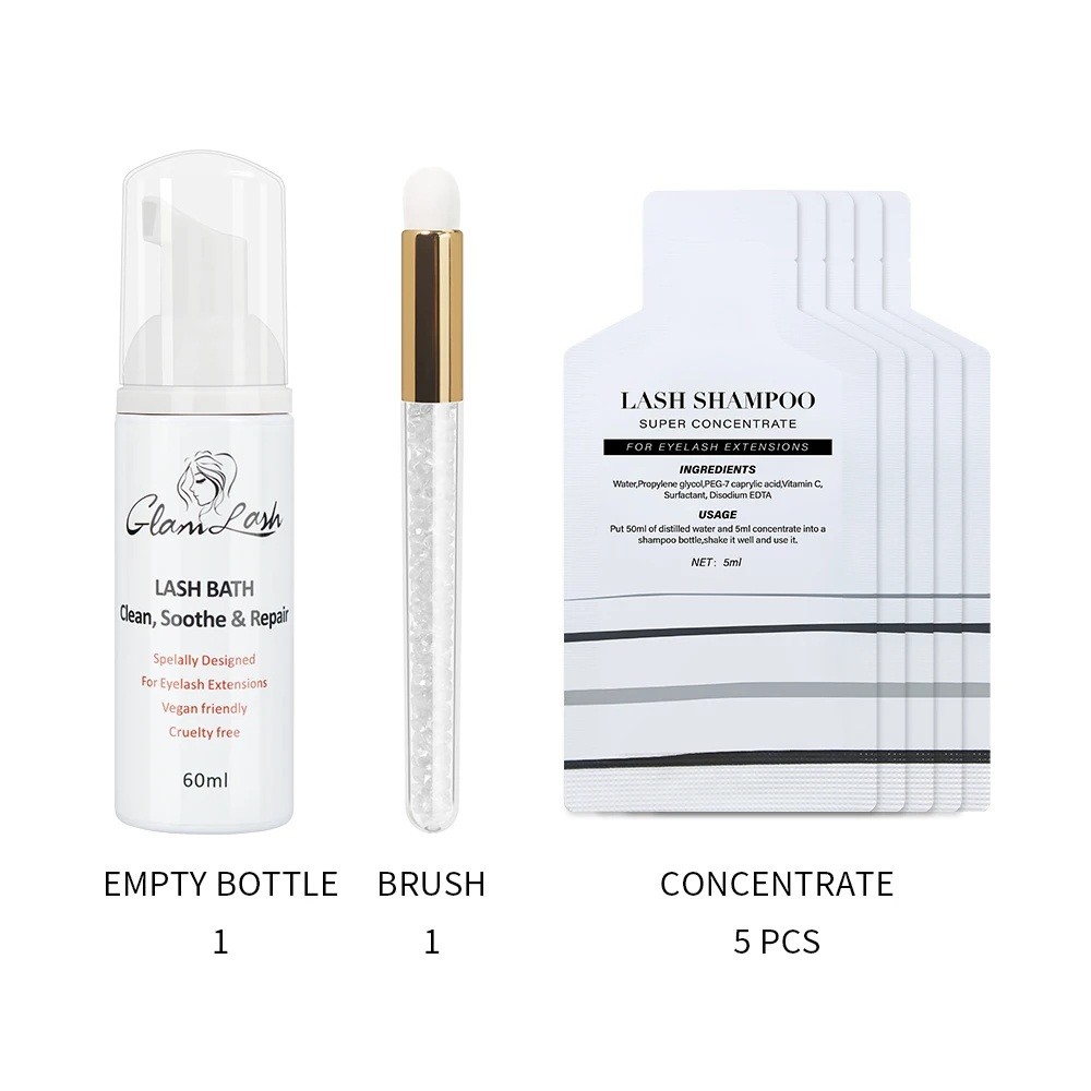 Praktisk sæt til forberedelse af skummende shampoo til vipper. Indeholder 5 stk koncentrat, 60 ml flaske og rengøringsbørste. Fuld beskrivelse