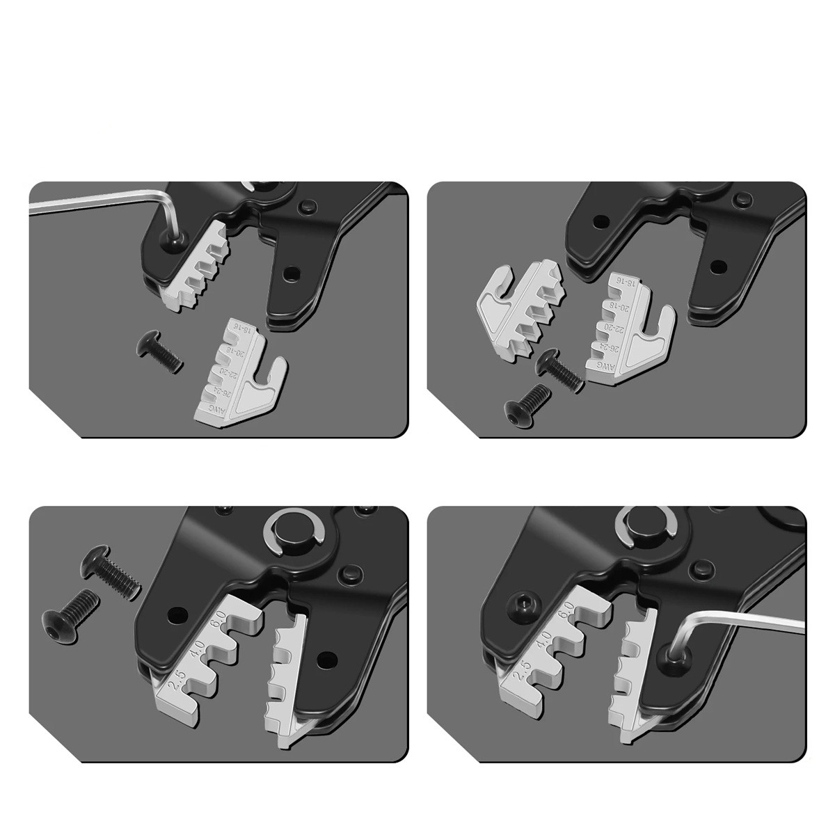 Med den forskellige geometri af kæberne er sættet velegnet til krimpning af stik som Dupont, JST, Molex, uisolerede og forisolerede stik, flade stik og specielle stik, der anvendes i sol- eller koaksiale systemer. Pakkeindholdet inkluderer seks præcist fremstillede kæber, der dækker de fleste almindelige typer ledninger og forbindelser. Denne fleksibilitet muliggør nemt arbejde på forskellige projekter uden behov for at eje flere separate værktøjer. Sættet er designet til at lette arbejdet selv for mindre erfarne brugere takket være den intuitive måde at udskifte kæberne på. Fast og ensartet krimpning øger betydeligt pålideligheden af elektriske forbindelser.