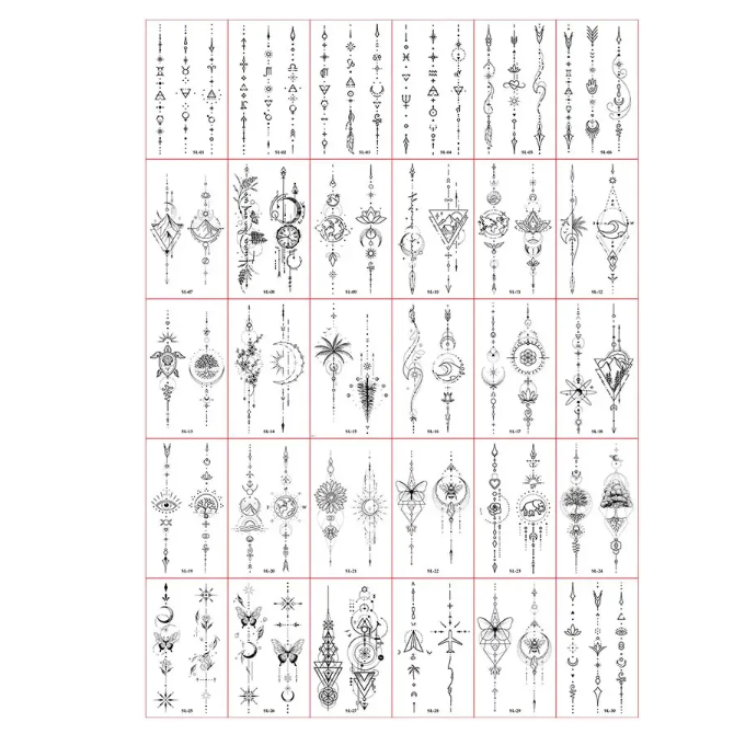 Midlertidige tatoveringer med fine geometriske og ornamentale mønstre. Vandafvisende, nem anvendelse og let at fjerne. Fuld beskrivelse