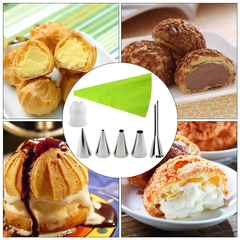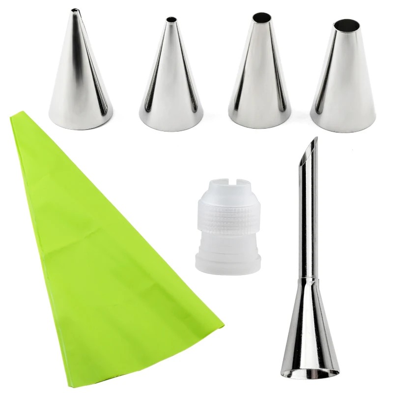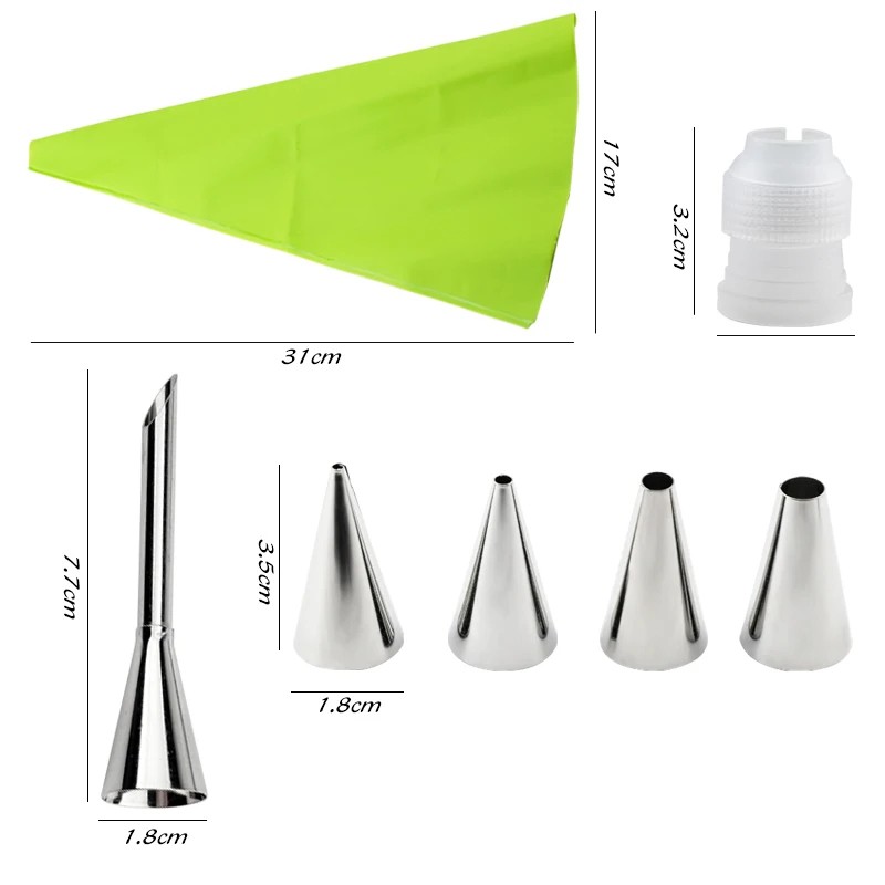 - Komplet sæt med 7 stk. – indeholder bage-spidser, sprøjtepose, kobling og lang rørformet spids.