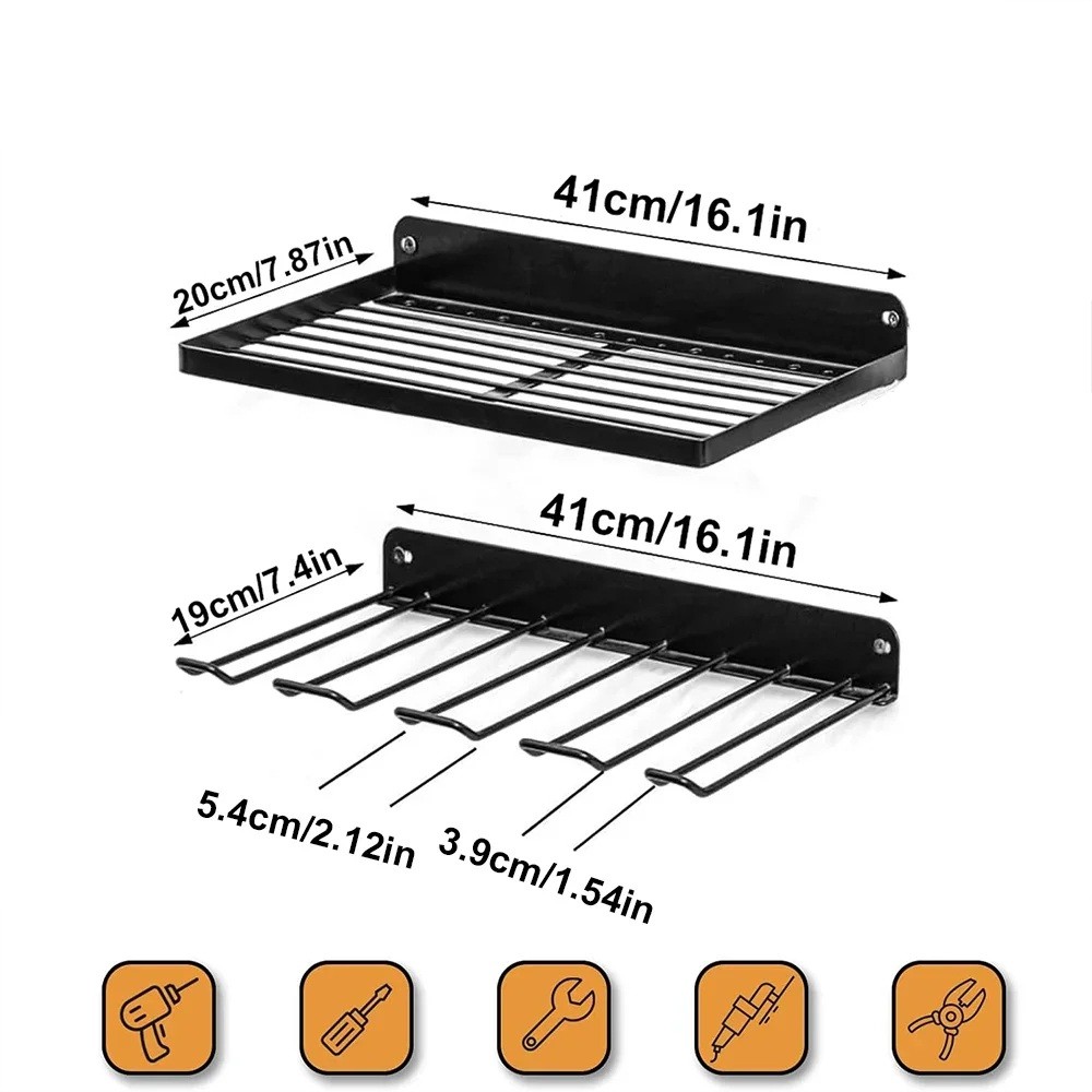 Sæt: metal væghylde 41 x 20 cm og holder med kroge 41 x 19 cm til batteridrevne boremaskiner og værktøj opbevaringssystem til værksted og garage