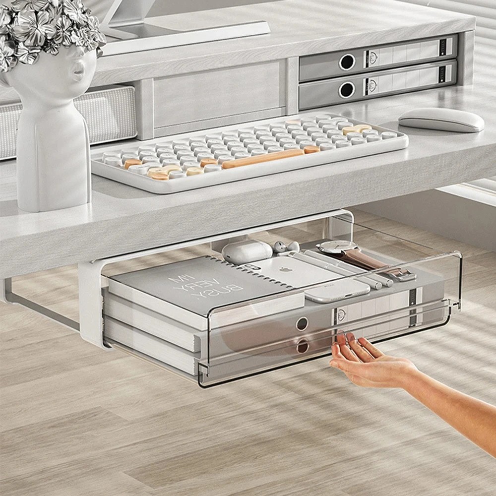 Praktisk under-bord organizer med udtræksskuffe sparer plads og gør det muligt at have småting og kontorartikler overskueligt ved hånden. Fuld beskrivelse