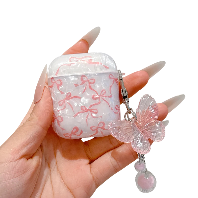 Sødt AirPods Pro etui med glitrende sløjfe mønster, støvafvisende og ridse- og stødresistent, giver adgang til alle porte og knapper. Fuld beskrivelse