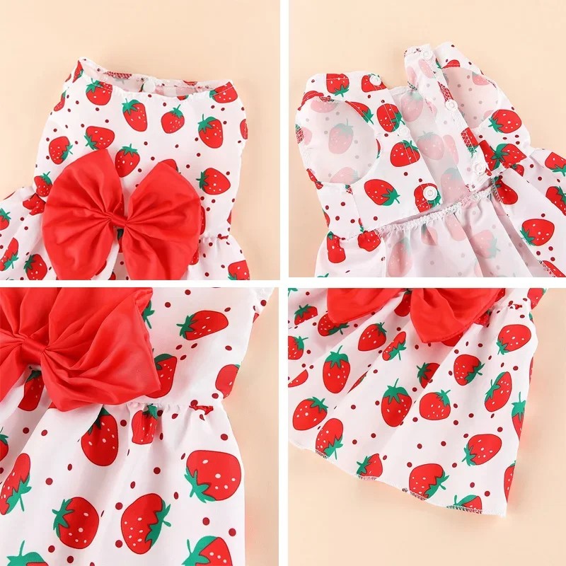 Sommerkjoler til hunde XS 22 x 26 cm Søde kjoler med jordbærmønster Rød sløjfe Stilfuldt tøj til små hunde Let og komfortabelt outfit