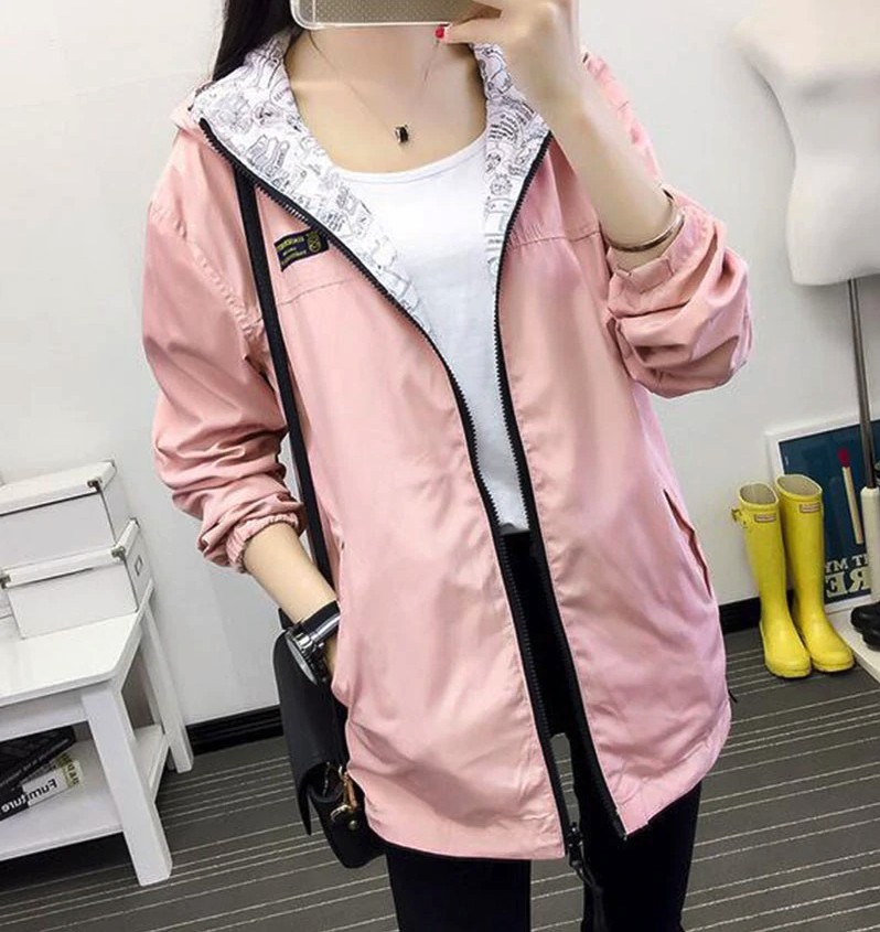 Vendbar damejakke, som er farverig på den ene side og har et stilfuldt mønster på den anden.