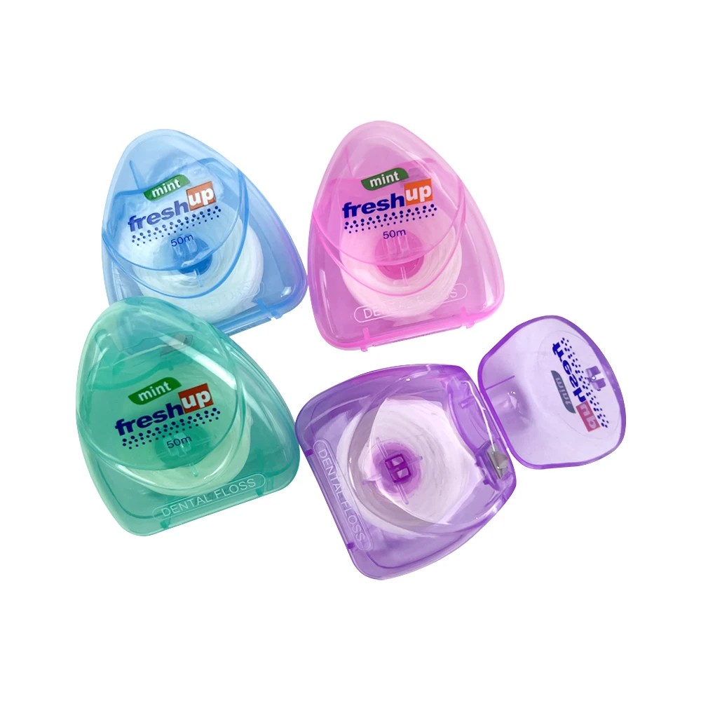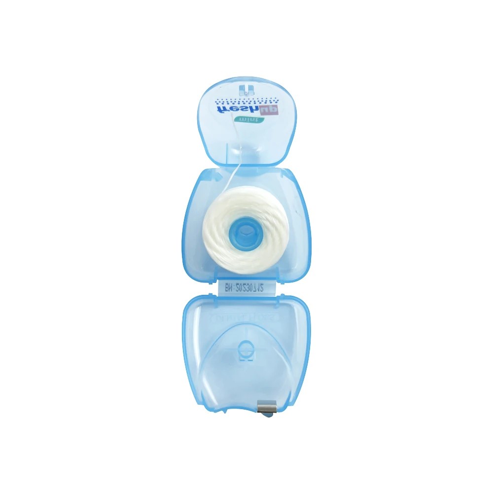 Tandtråd 50 m i plastbeholder med skærer til interdentalt rengøring hvid tråd blå beholder til daglig mundhygiejne