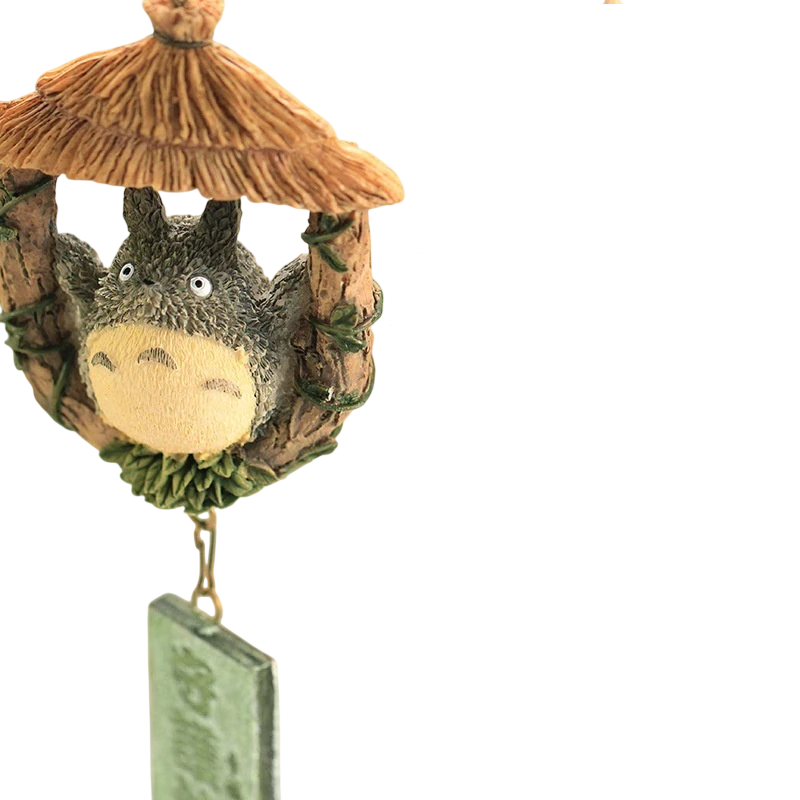 Stilfuld japansk vindklokke med figuren Totoro i en længde på 38 cm. Original hængende dekoration lavet af harpiks, kobber og plast til hjemmet, balkonen og haven. Fuld beskrivelse