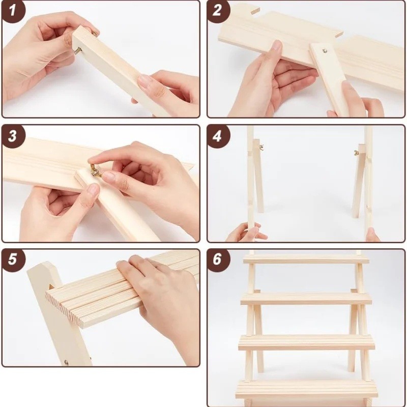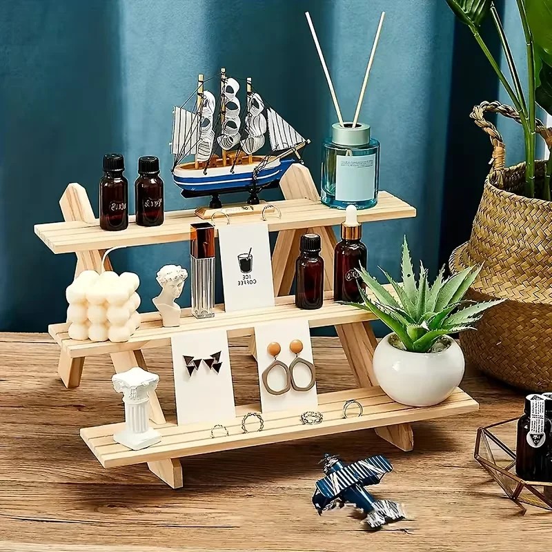 Dette stativ bruges til overskueligt at udstille smykker og små genstande på flere niveauer. Konstruktionen af naturligt træ skaber et enkelt udseende, der passer til et bord, en hylde eller en kommode. Stativet gør det muligt at organisere øreringe, ringe eller andre småting på ét sted.