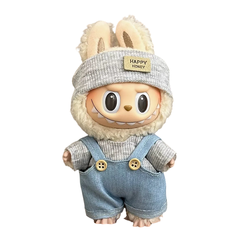 Udklædning til Labubu-figur. Gråt pandebånd. Grå sweater og denimoveralls. Stilfuldt kostume til dukker. Tilbehør til 15-17 cm samlerfigurer.