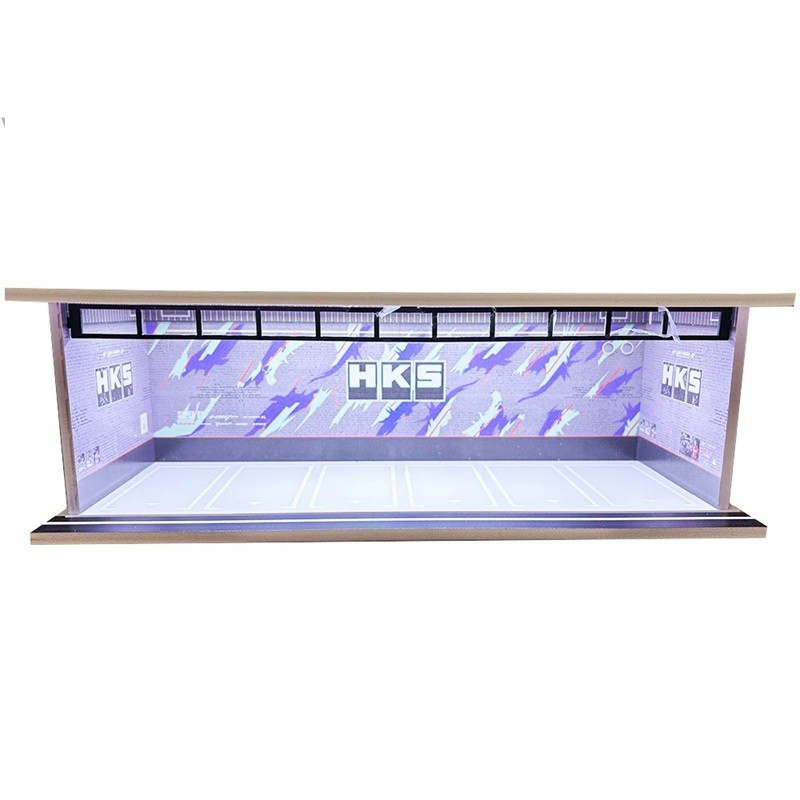 Udstillingsdiorama garage til biler 30 x 13,5 x 10 cm Skala 1:64 HKS lilla tuningvæg med billeder Parkeringsscene for bilmodeller PVC ABS