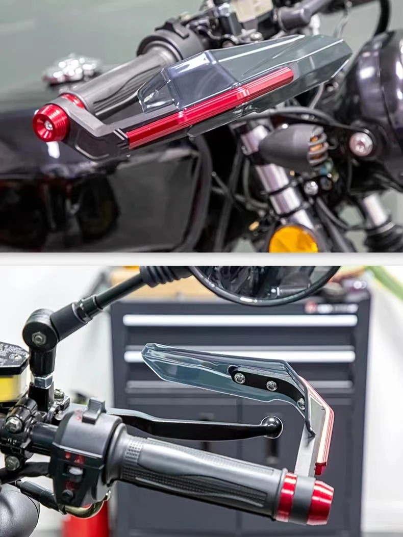 Holdbar styrbeskytter med aluminium forstærkning beskytter bremsegreb og hænder, velegnet til motorcykler, scootere og elcykler. Fuld beskrivelse