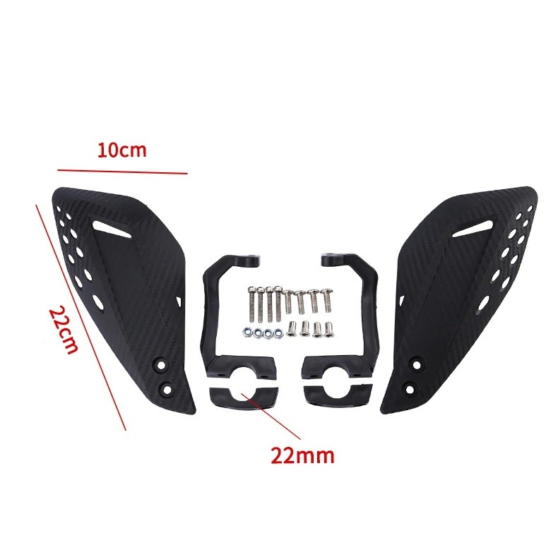 Letvægts og holdbare håndbeskyttere i PP med carbon-look, montering på styr 22 mm, beskytter mod vind, regn og stød i terrænet. Fuld beskrivelse