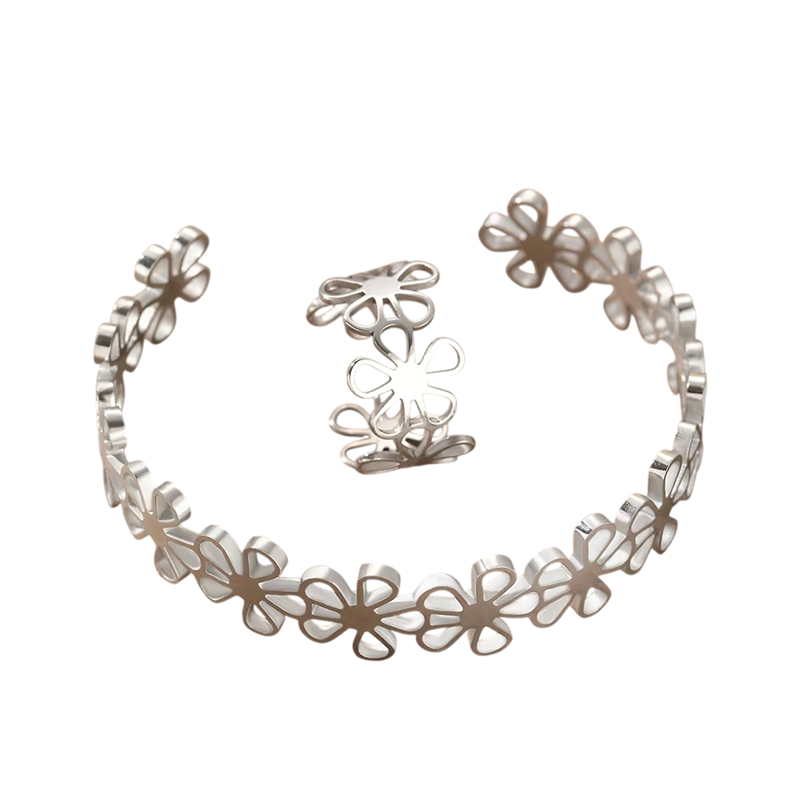 Dette usædvanlige retro sæt armbånd og ring fanger opmærksomheden med sit originale motiv af hule blomster og tidløse design. Smykkerne er lavet af højkvalitets rustfrit stål, som er stærkt, holdbart og velegnet til langvarig brug. Overfladen er fadede fri, hvilket bevarer sit udseende og glans selv ved daglig brug. Takket være den justerbare størrelse kan både ringen og armbåndet nemt tilpasses forskellige håndtyper, hvilket sikrer komfort og fleksibilitet. Det retro blomsterdesign giver smykkerne en unik karakter og gør dem til et stilfuldt tilbehør samt en original gave.