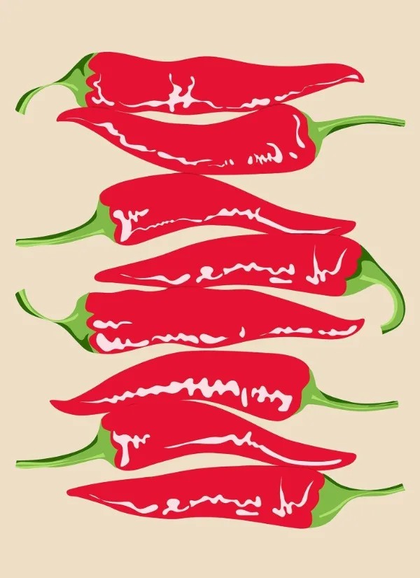 • Markant motiv af chilli peberfrugter med gastronomisk stil