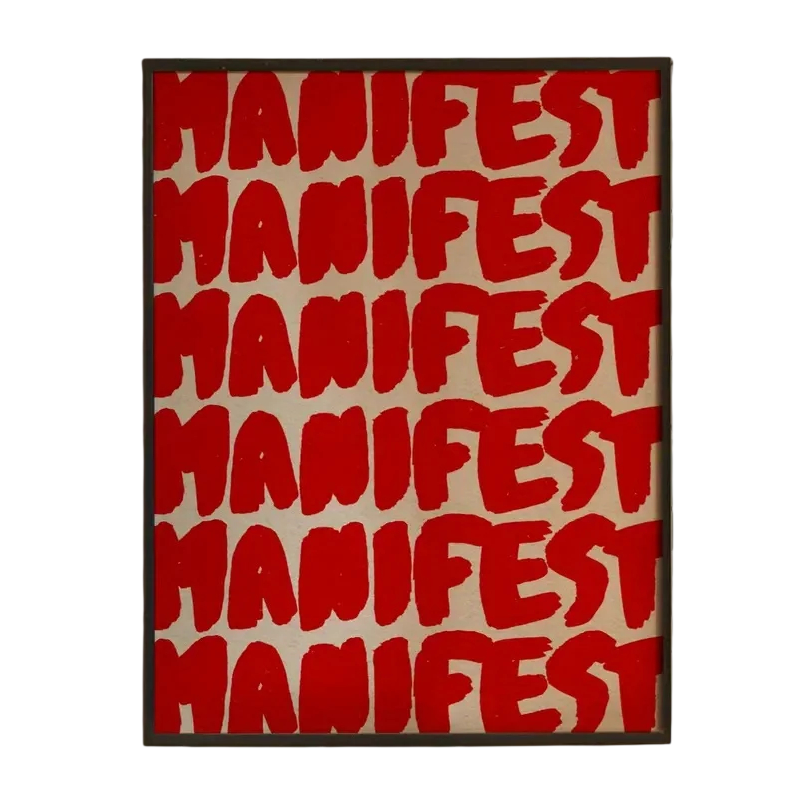Denne vægplakat fanger opmærksomheden med et markant typografisk motiv, der består af den gentagne tekst „manifest“. Motivet er arrangeret i regelmæssige rækker, hvilket skaber en dynamisk og overskuelig visuel effekt. Takket være det kontrastfulde farvevalg fremstår plakaten tydeligt og kan nemt blive et dominerende element i indretningen. Størrelsen 40 x 60 cm er velegnet til større vægflader og giver mulighed for, at detaljerne i motivet kan komme til sin ret. Trykket på lærred giver overfladen en blød struktur og et naturligt udseende.