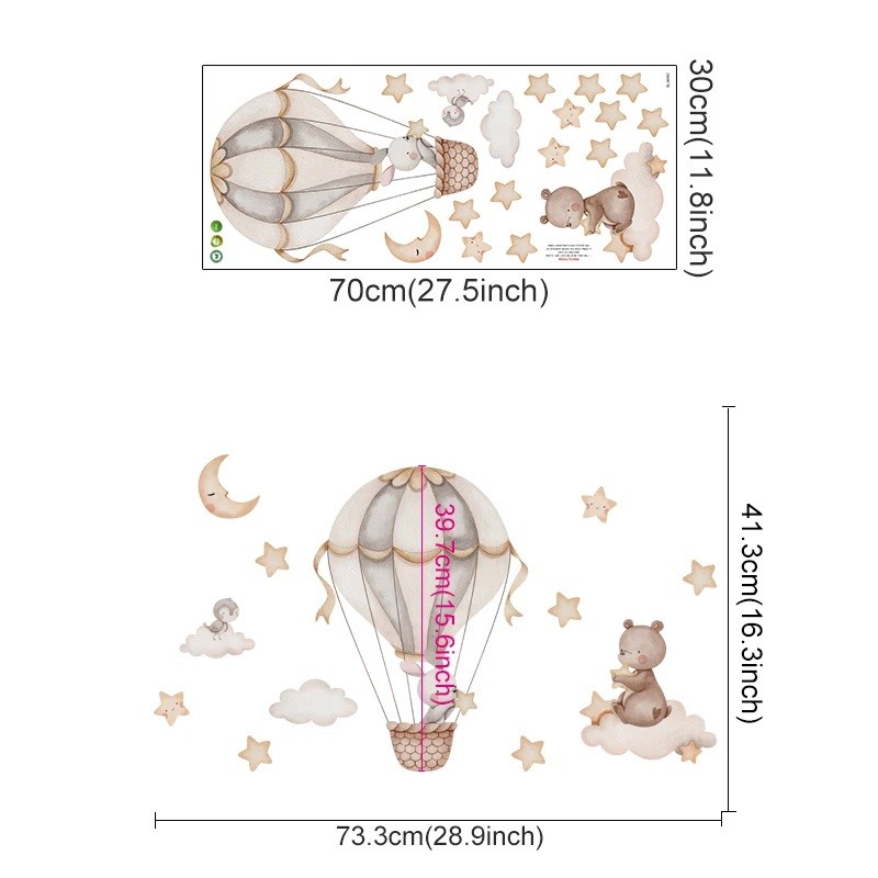 Designet med bjørnen og kaninen i ballon skaber en rolig og drømmende atmosfære, der er ideel til børneværelser og vuggestuer. Dekalen er holdbar, vaskbar og farverne holder længe uden at skalle af. Dens anvendelse er hurtig og enkel, kræver ikke lim, så alle kan klare det på få minutter.