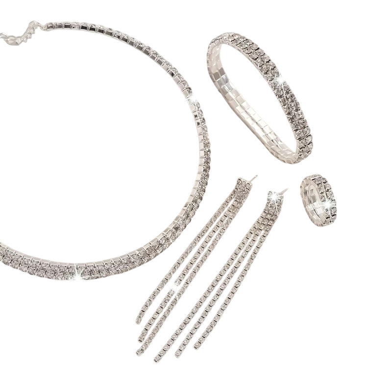Dette strålende smykkesæt er det perfekte valg for kvinder, der ønsker at stråle ved særlige lejligheder. Det komplette sæt indeholder en halskæde, øreringe, et armbånd og en ring, som sammen skaber et harmonisk og luksuriøst udseende. De glitrende sten giver smykkerne en festlig karakter og fremhæver den elegante stil. Takket være det gennemarbejdede design er sættet velegnet til bryllupper, banketter, fester og andre sociale arrangementer. Dette luksus smykkesæt til kvinder er den ideelle løsning for en perfekt koordineret påklædning uden behov for at lede efter individuelle accessories separat.